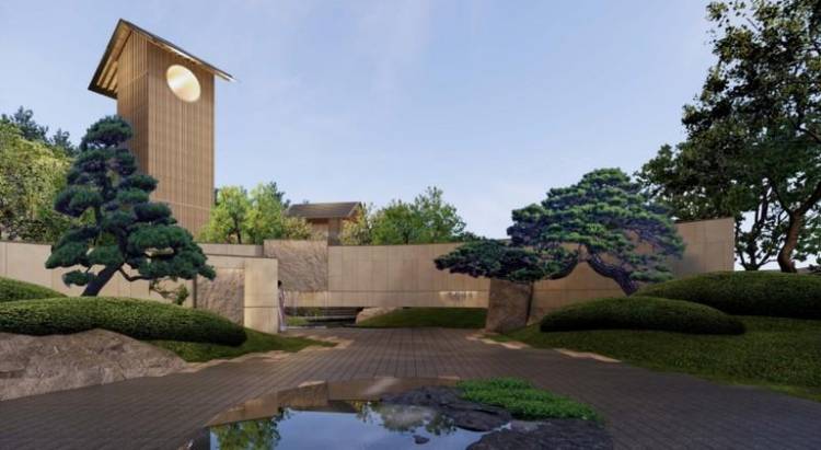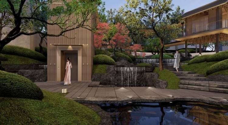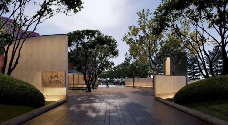 二境·高远:缓步径入,“一重山门隔世,十里花径洗心”的东方意境,桃源意境渐展。小径设计灵感来源于北宋范宽《溪山行旅图》中的“时宽时窄、自然写意”,山门设计则暗含“天圆地方”、“四水归堂”的东方哲学,营造出归家的仪式感与尊崇感。