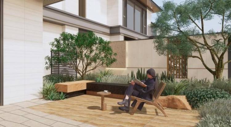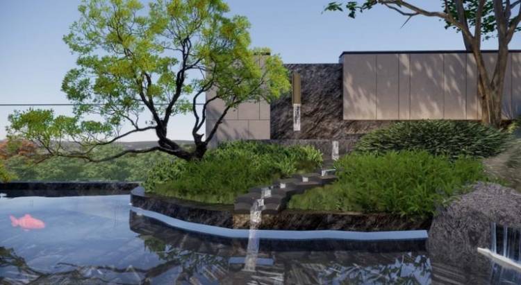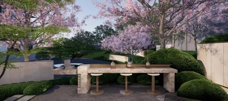 四境·平远:空山新雨般的意境中,茶花园点缀数十棵樱花树,形成“绿中有红,红中有绿”的景观层次。茶园不仅是视觉上的享受,更是未来业主社交与休憩的共享空间,春日可采茶制茶,四月可赏樱纷飞,营造出“行山品茶,以茶观心”的生活情境。