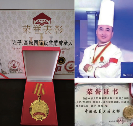 高松的烹饪生涯,是一条清晰而厚重的传承之河。他的底气源于横跨国宴、药膳、多菜系的独特师承脉络。作为注册中国国宴谭家菜传承文化大师,他先后师从国宴大师王继明、徐权,奠定坚实基础。尤为关键的是,他得国宝级药膳大师杨志智亲传,领悟“膳中有药,吃不见药”的化境;拜国宴创始人王圣奎为师,深谙“精益求精、庄重典雅”的准则;并获人民大会堂国宴总厨胡桃生、意境菜大师董振祥等泰斗指点。这份融合国宴严谨与药膳智慧的传承,使他既通晓食材性味调和的中医哲理,又能以殿堂级的工法将其呈现,为所有创新筑牢了不可撼动的根基。