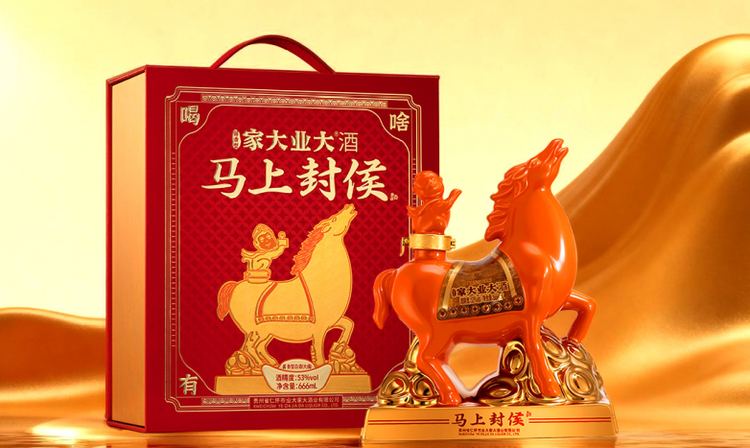 压轴登场的是家大业大酒·马上封侯。橙色的骏马昂扬向上,马背上灵猴献瑞,脚下金元宝熠熠生辉,寓意“马上封侯”、“马上有财”。这第三杯酒,敬的是吉祥。