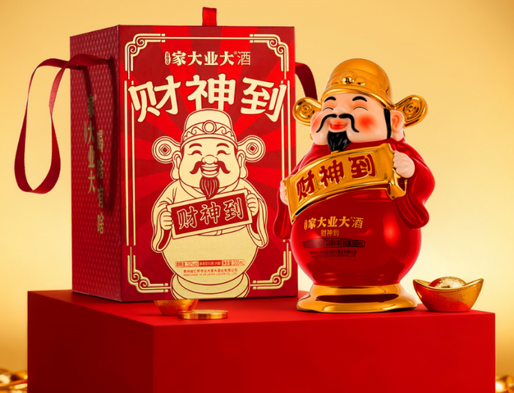 紧接着,喜气洋洋的财神形象跃然瓶上——家大业大酒·财神到。笑容可掬的财神爷,仿佛亲自将好运与财富送入家门。这第二杯酒,敬的是富贵。举杯间,不仅是对物质丰裕的向往,更是对智慧与机遇的迎接。