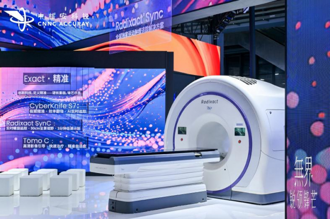 面向临床放疗对设备物理精度的极致需求,中核安科锐在本次展会上带来了一如既往的卓越答案——Radixact SynC螺旋断层放射治疗系统以及CyberKnife S7 X射线立体定向放射外科治疗系统。Radixact SynC作为本届展会的主展设备,通过革命性的软硬件深度融合,实现了运动肿瘤的“实时追踪、瞬时修正”,重塑放疗的精准与效率极限。其核心突破在于将Synchrony实时追踪技术与同轴共环架构无缝集成,配合“灵动”铅门、超快速Flash二元气动多叶光栅及ClearRT螺旋kVCT成像系统,由此,设备实现了对肺部等易移动靶区在自然呼吸下的“毫秒级”追踪修正与高精度照射,为患者带来更高效、精准、安全的全新放疗体验。
