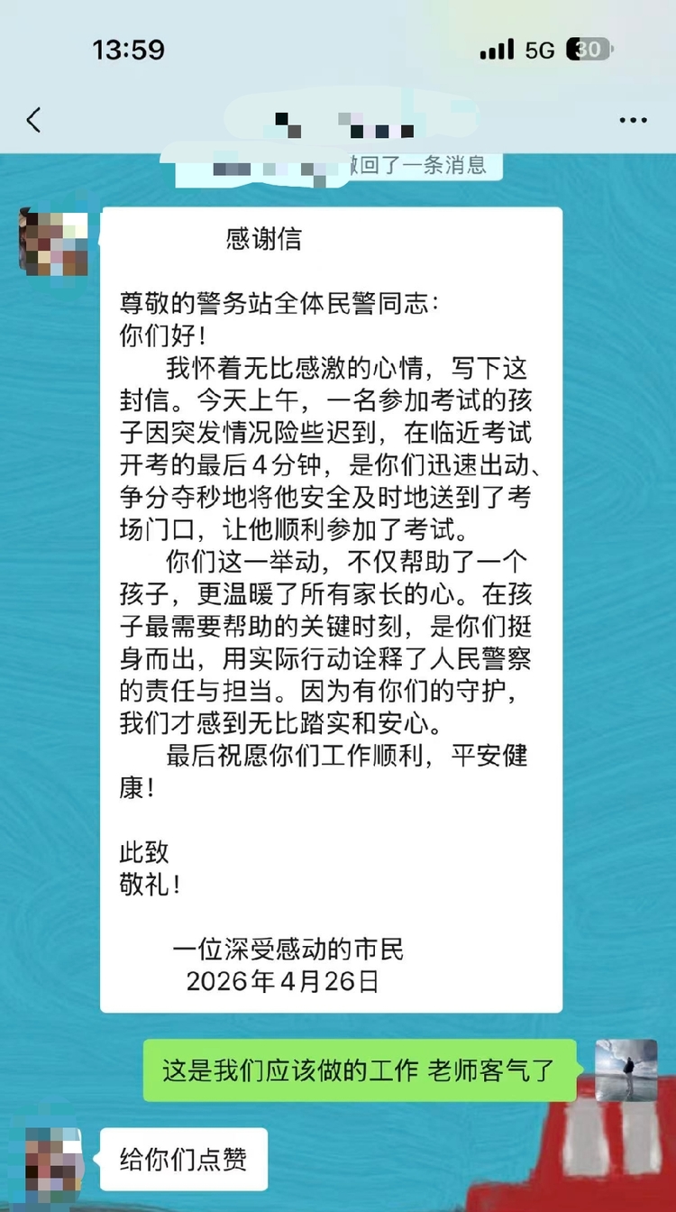 “在孩子最需要帮助的关键时刻,是你们挺身而出,用实际行动诠释了人民警察的责任与担当。”一位目睹全程的考场老师深受触动,特意写下感谢信。信中写道,民警的守护让大家倍感踏实安心,字里行间满是“给你们点赞”的由衷赞许。